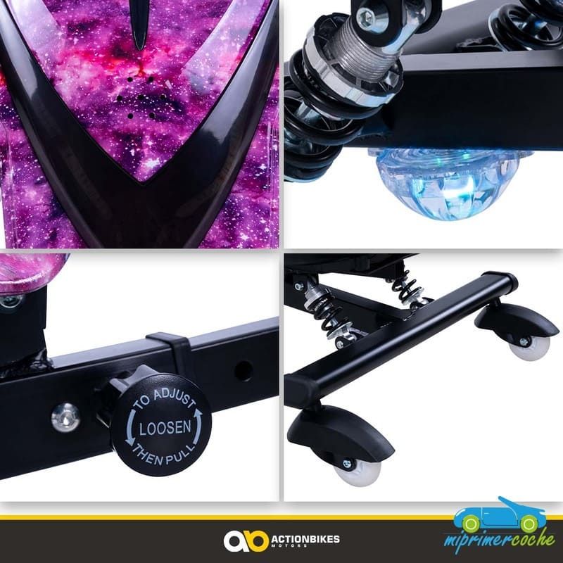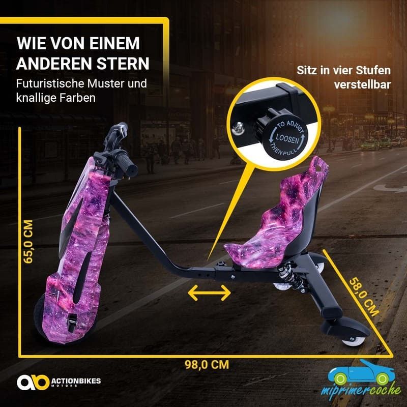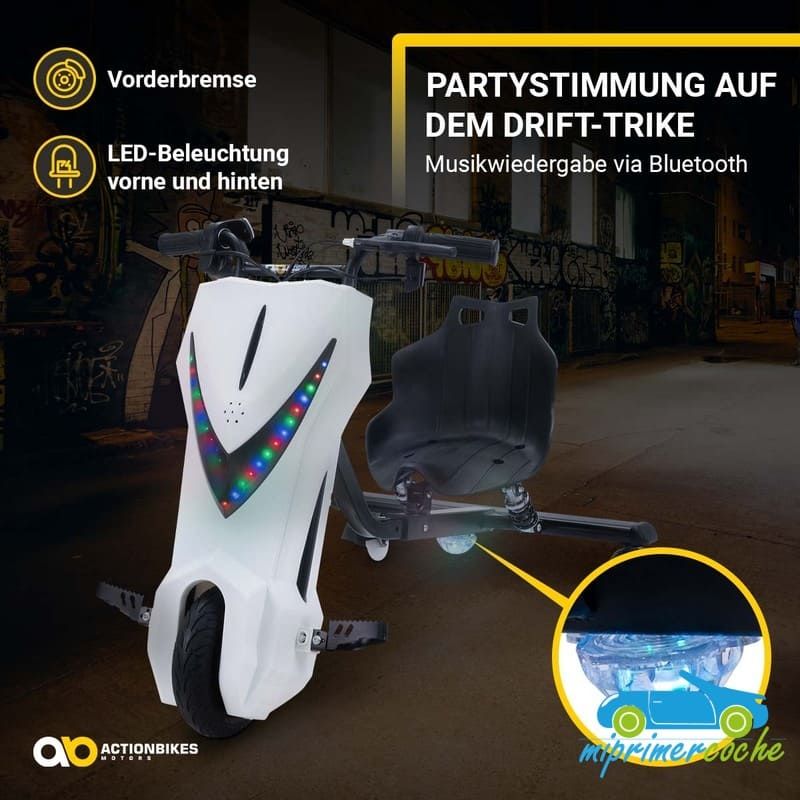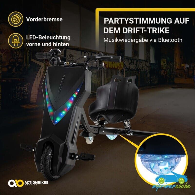 · ¡No son solo las maniobras de conducción las que llaman la atención en este triciclo eléctrico! El patinete de deriva impresiona con su iluminación LED intermitente de colores . En la parte delantera se ilumina formando un triángulo cónico hacia el suelo, mientras que en la parte trasera los LED resaltan los rodillos de deriva especiales