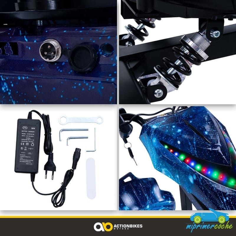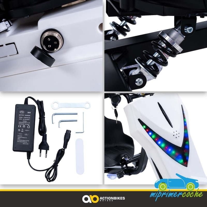 · batería 36V4.4Ah · tiempo de carga : una vez montado y comprobar que el coche funciona , debe conectarse a la corriente eléctrica con su cargador y la primera carga tiene que ser de 4-5 horas , las demás cargas de 8 a 10 horas para una carga completa . Nunca no debe pasar mas de 12 horas en carga y nunca no agotar la batería al máximo .
